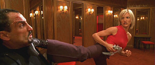 That’s really about all you need to know, for the plot offers nothing much of interest. Instead, the movie’s all about the production, with one bright and vibrant scene after another. The film exists to put the Angels in a variety of lively situations and have some fun. In that regard, it generally succeeded. The movie’s action took many cues from flicks like The Matrix and it provided lots of goofy excitement. As action heroines, both Liu and Diaz best fit the roles. Liu has a harsh, dominatrix appeal that makes her interesting to watch as she abuses others, while Diaz seems able to do just about anything. I’m not wild about her bone-thin, bleached blonde look in the film, but as time passes, I become more and more impressed with her skills as an actress. She appears able to do a nice variety of parts, from the ruthless executive of Any Given Sunday to the sweet every-girl of There’s Something About Mary to the nerdy obsessive of Being John Malkovich. Here she goes for a serious Pollyanna vibe as wide-eyed innocent Natalie, but she’s also able to put up a fight with the best of them. Diaz possesses a strong physicality that the others lack. Liu’s fights worked just because she looked so good in the part, but Diaz backs up her action scenes with fluid movement. As for Barrymore, I thought her bits were the least convincing. Although she’s developed into a lovely young woman, she’s beefier than the other two, and her body seems ill-suited for the forms of graceful, smooth fights we find. Drew looks like she’d be more at home in a bar brawl than during her Matrix-esque wire work.