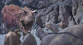The tale follows orphaned dinosaur Aladar (voiced by D.B. Sweeney). As the film starts, he’s still egg-based, and due to the intervention of a bunch of critters, he doesn’t hatch until he’s been swept far from home. He ends up in the possession of a family of lemurs who - despite some reservations - take him in as their own. Aladar grows up happy but somewhat lonely since he’s the only one of his kind in the neighborhood. That changes once the meteors fall. Disaster strikes the land, so Aladar and his family head out to find friendlier climes. Before long they encounter a band of other dinos headed toward their garden of Eden where they can eat, drink, and be merry. Led by tough-guy Kron (Samuel E. Wright, best known as Sebastian from The Little Mermaid), these beasts live in a seriously Darwinian society. Inevitably, Aladar introduces more kind and gentle tendencies to the group and shows himself to be a natural leader. Also inevitably, Kron doesn’t dig this, and the two head toward the inevitable showdown complicated by the inevitable love interest: Kron’s sister Neera (Julianna Margulies). Inevitably, all concludes on a happy note. While the basic story is sturdy, the lack of inventiveness renders it fairly dull and drab. Due to a combination of an anonymous vocal performance from Sweeney and some weak writing, Aladar is one of the least compelling Disney heroes to trot along in quite some time; we care about him in a generic manner because we’ve been trained to do so, but Aladar never earns our affection. Neera and Kron also come across as ordinary, though their problems result more from an absence of character development; the two get little time on screen to shore up their stereotypical presences.